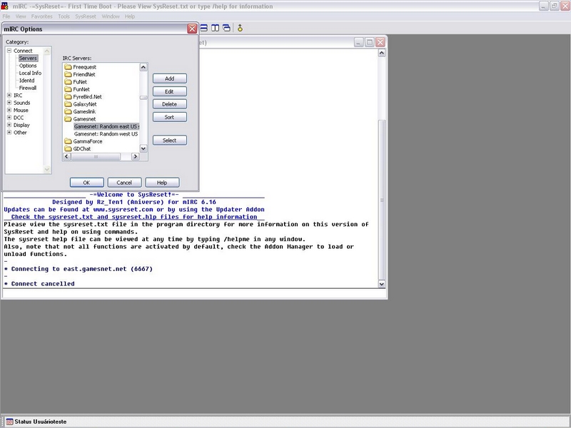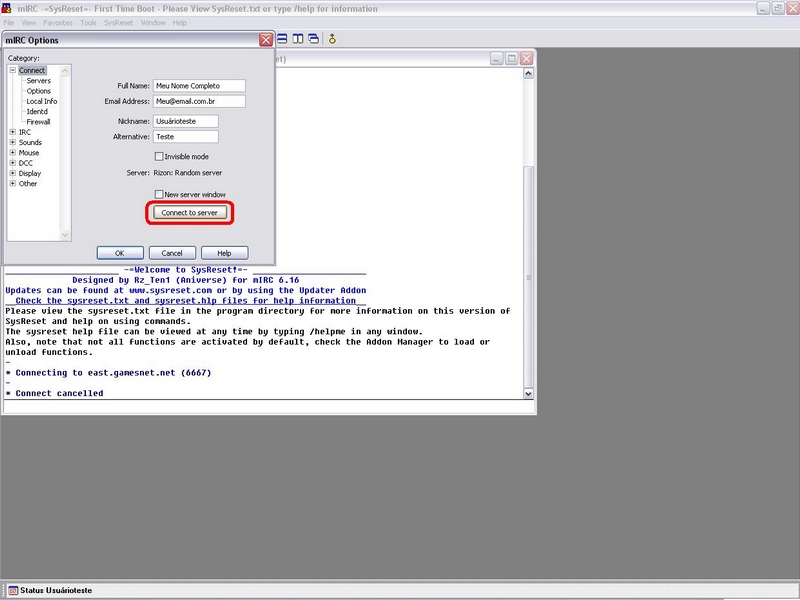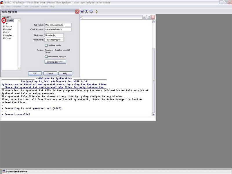 Isso vai abrir o programa (mIRC / Sysreset). Como e a primeira vez que voce o usa, alem dele a janela de opcoes vai estar aberta na diretriz "connect". La voce tera que preencher informacões sobre voce. Sao elas: