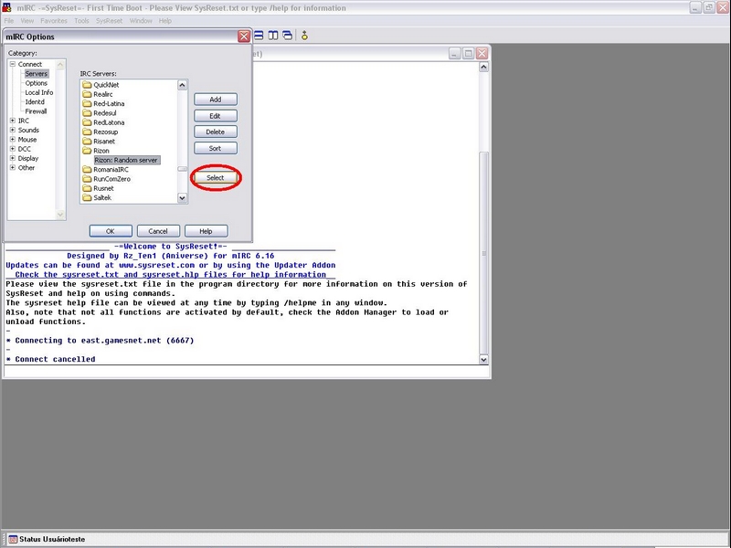 Dentre estes varios servers (Em ordem alfabetica), voce seleciona o Server "Rizon". Voce notou esses simbolos que lembram pastas na frente dos nomes dos servidores? Quando chegar na pasta "Rizon", clique duas vezes nela ter acesso ao "Rizon: Random Server" que voce vai selecionar e depois clicar em "Select" . (Como na figura)