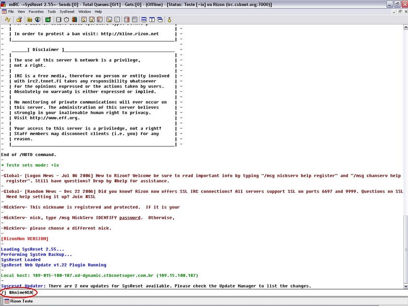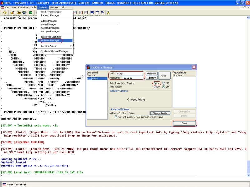 Obs: Apos o registro, voce pode automatizar o processo de reconhecimento por senha. Basta ir na guia "Sysreset > NickServ Manager", colocar seu Nick e senha nos lugares devidos, ligar o "Auto Identify on Startup", e confirmar. (Tudo demonstrado na figura abaixo)